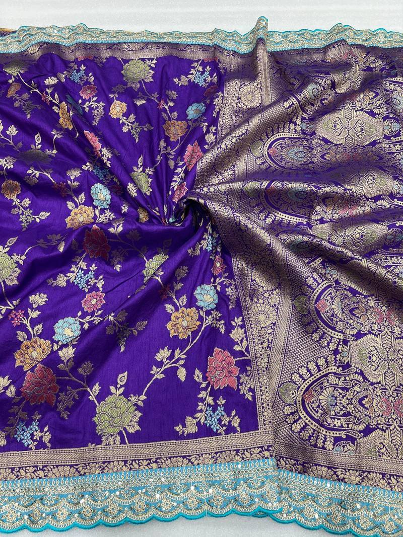• Saree : Color- Purple / Fabric- Silk Blend • Blouse : Color- Blue / Fabric- Silk Blend Saree Details