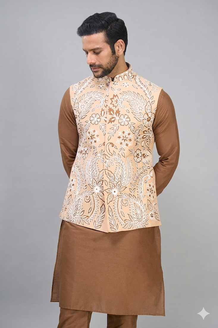 crafted from silk fabric, the kurta and nehru jacket offer a smooth texture with a subtle sheen that enhances the overall appearance. the fawn jacket features detailed embroidery across the front, adding depth and a traditional touch while keeping the design balanced. the darker kurta underneath creates a pleasing contrast and completes the overall look.