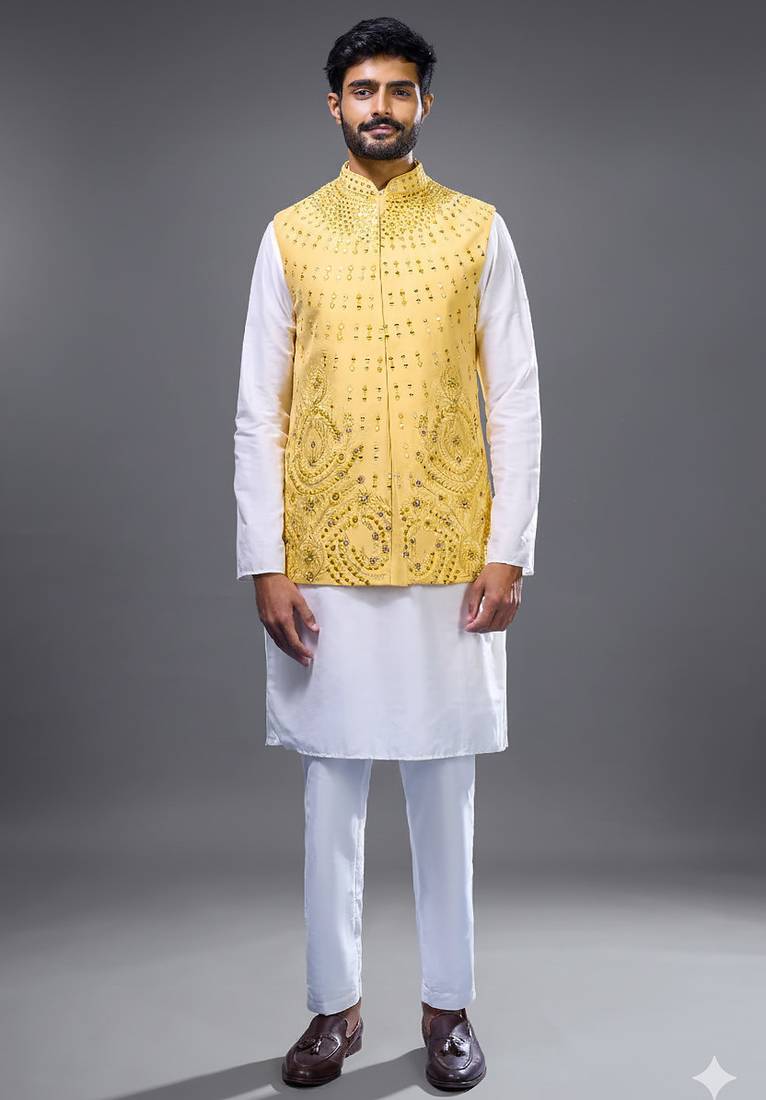 If you find the product for less we'll match it! Know Moreadd a vibrant touch to your festive look with this yellow kurta jacket set for men, designed with striking mirror and thread embroidery. the set includes a classic white kurta paired with a sleeveless jacket adorned with intricate mirror work and detailed patterns that reflect light beautifully. crafted from premium fabric, it ensures comfort while maintaining a sharp and structured silhouette. the bright yellow hue brings a cheerful and celebratory vibe, making it perfect for weddings, haldi functions, and festive gatherings. the elegant embroidery enhances its ethnic appeal, while the modern fit keeps your style on point. pair it with traditional footwear for a complete look that blends tradition with contemporary charm effortlessly.