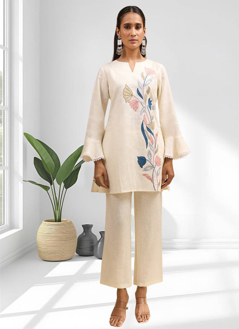 • Product Id : 4686177 • Package Details : 1 Top/1 Bottom • Type : Party Wear Kurtis • Occasion : Wedding • Fabric : Linen • Work : Embroidered • Type : Resham Embroidery • Look : Designer • Sleeve : Quarter Sleeve • Color : Cream • Stitching : Stitched • Length : 32.0 Payments [+]