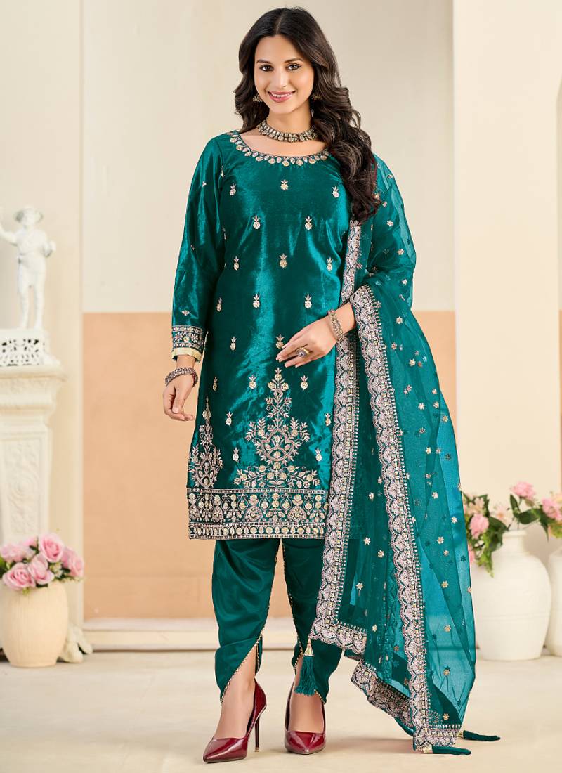 Teal Embroidered Sequence Velvet Dhoti Style Semi stitched