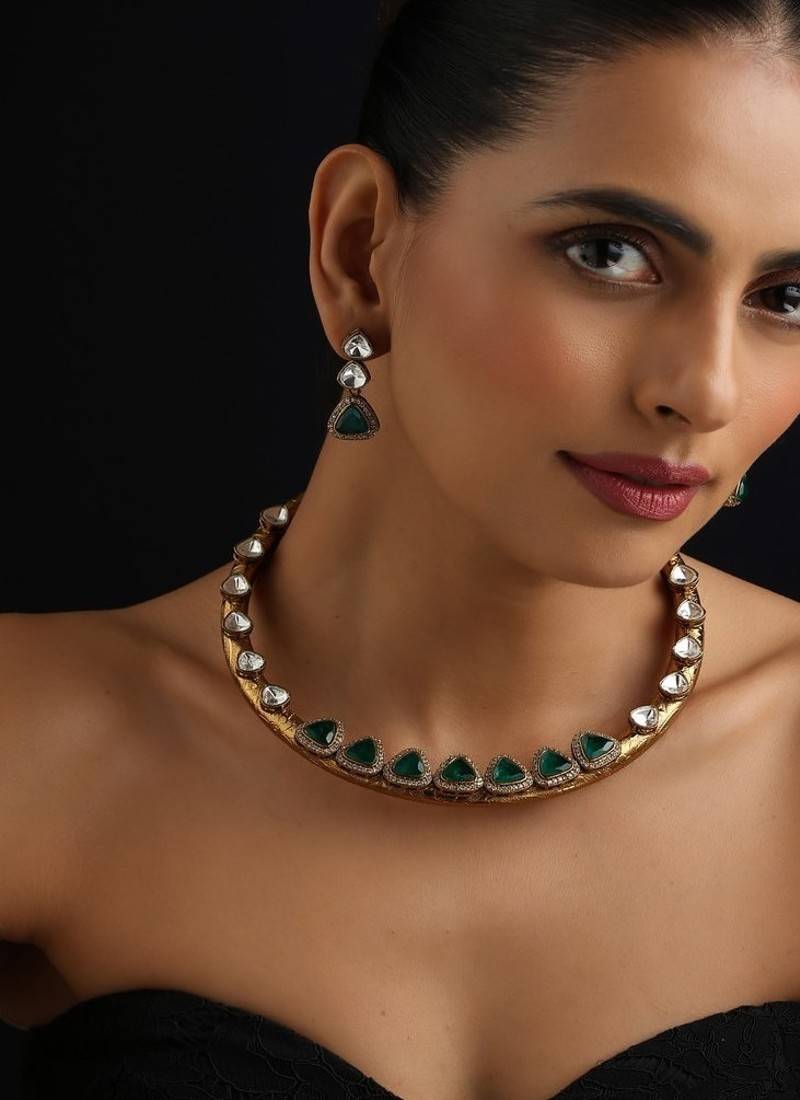 A Luxurious Statement Piece, This Gold-Plated Polki Necklace Features A Captivating Green Stone At Its Center. The Vibrant Hue Of The Stone Is Beautifully Accentuated By The Intricate, Rustic Charm Of Uncut Polki Diamonds. Handcrafted With Traditional Artistry, This Necklace Exudes A Regal Elegance And Is Perfect For Adding A Touch Of Sophisticated Glamour To Any Special Occasion