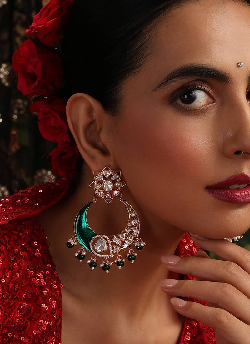 These Gold Plated Kundan Chandbali Earrings Are Adorned With Vibrant Green Stones, Exuding Timeless Elegance And Traditional Charm. Crafted With Intricate Detailing, They Beautifully Enhance Festive And Bridal Looks. Perfect For Weddings And Special Occasions, They Add A Graceful, Statement Touch To Ethnic Ensembles.