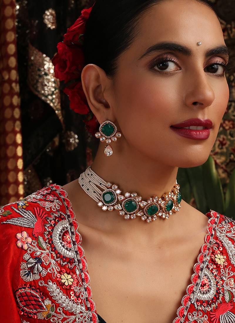 This Gold Plated Kundan Choker Necklace Set Is Adorned With Vibrant Green Stones, Radiating Timeless Elegance And Regal Charm. Featuring Intricate Kundan Craftsmanship, It Beautifully Enhances Traditional And Festive Attire. Perfect For Weddings And Special Occasions, It Adds A Graceful, Statement Touch To Ethnic Ensembles.