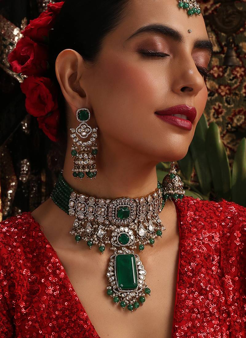 This Gold Plated Kundan Choker Necklace Set Is Adorned With Vibrant Green Stones, Exuding Timeless Elegance And Regal Charm. Featuring Intricate Craftsmanship, It Beautifully Enhances Traditional And Festive Attire. Perfect For Weddings And Special Occasions, It Adds A Graceful, Statement Touch To Ethnic Ensembles.