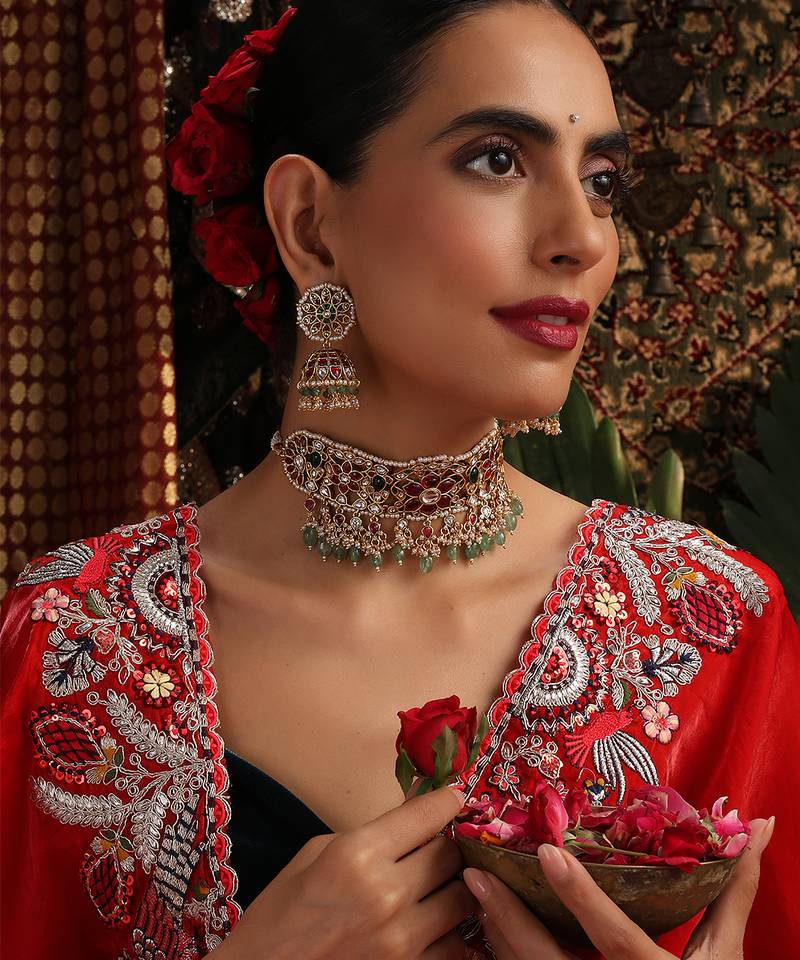 This Gold Plated Kundan Choker Necklace Set Is Adorned With Vibrant Multicolor Stones, Exuding Timeless Elegance And Festive Charm. Crafted With Intricate Kundan Work, It Beautifully Enhances Traditional And Bridal Attire. Perfect For Weddings And Special Occasions, It Adds A Graceful, Statement Touch To Ethnic Ensembles.
