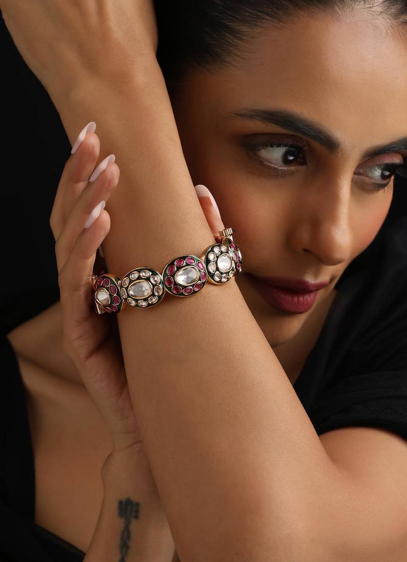 • Product Id : 4622627 • Package Details : 1 Bangle • Type : Rings • Occasion : Wedding • Jewellery Work : Polki • Color : Multicolor • Plating : Yellow Gold • Base Material : Brass Payments [+]