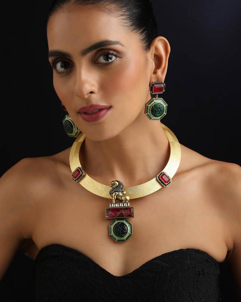 This Gold-Plated Multicolour Polki Necklace Radiates Regal Elegance And Festive Charm. Adorned With Intricate Polki Work And Vibrant Coloured Stones, It Is Finished With Rich Gold Plating For A Luxurious Appeal. Perfect For Weddings, Festive Occasions, And Celebrations, It Beautifully Complements Both Traditional And Fusion Ensembles.