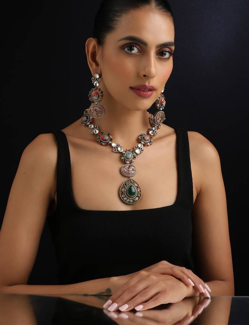 This Gold-Plated Multicolour Polki Necklace Set Exudes Festive Elegance And Royal Charm. Featuring Intricate Polki Work Adorned With Vibrant Coloured Stones, It Is Finished With Luxurious Gold Plating For A Rich Appeal. Perfect For Weddings, Festive Occasions, And Special Celebrations, It Pairs Beautifully With Both Traditional And Fusion Outfits.