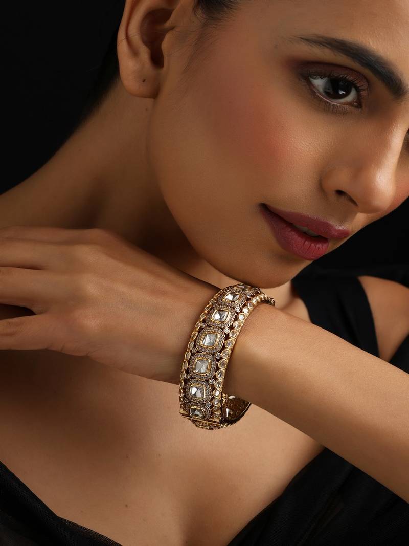 • Product Id : 4645779 • Package Details : 1 Bangle • Type : Bridal Bangles & Bracelets For Women • Occasion : Wedding • Look : Traditional • Jewellery Work : Polki • Color : Gold • Plating : Yellow Gold • Base Material : Brass • Care : Spot Cleaning Only. Store In A Separate Box. Keep Away From Fragrance And Water. • Finish : Glossy Payments [+]