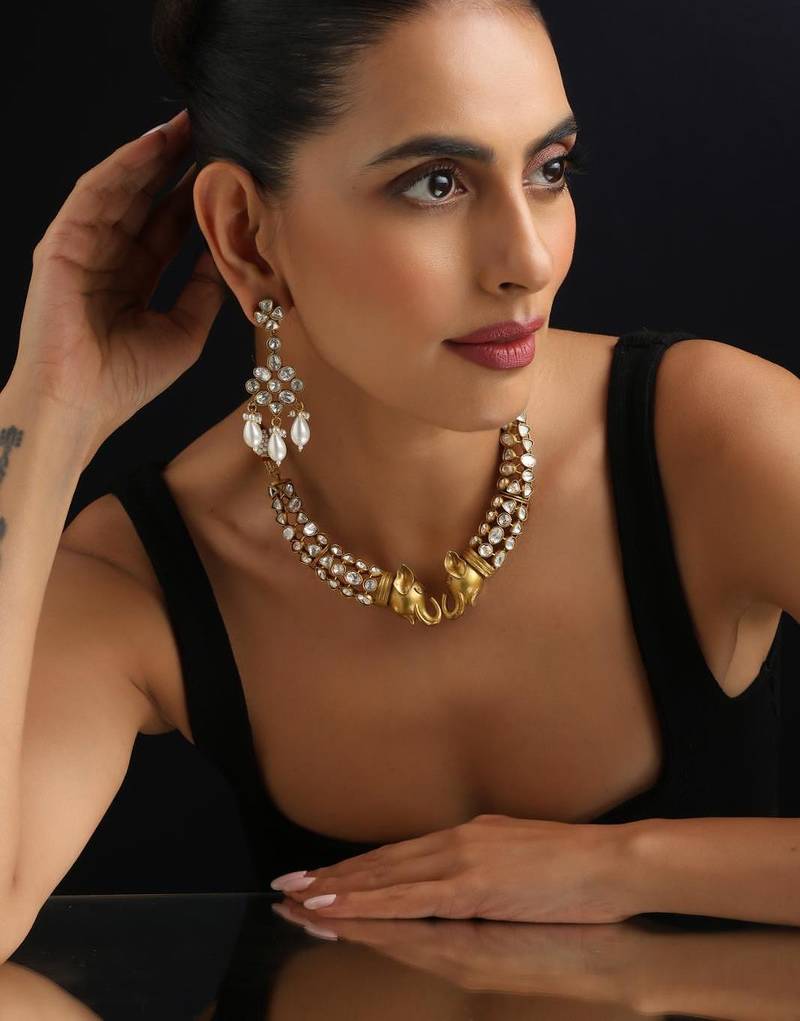 This Gold-Plated Polki Necklace Exudes Classic Elegance And Regal Charm. Featuring Intricate Polki Work, It Is Finished With Rich Gold Plating For A Luxurious Touch. Perfect For Weddings, Festive Occasions, And Cultural Celebrations, It Beautifully Complements Both Traditional And Contemporary Outfits.