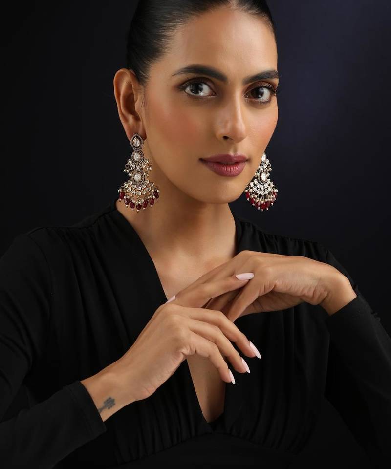 • Product Id : 4622618 • Package Details : 1 Pair Of Earrings • Type : Earrings • Occasion : Wedding • Jewellery Work : Polki • Color : Red • Plating : Yellow Gold • Base Material : Brass Payments [+]