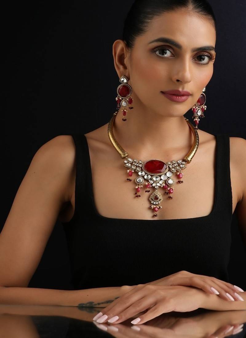 • Product Id : 4645806 • Package Details : 1 Necklace / 1 Set Earrings • Type : Necklace Sets • Occasion : Wedding • Look : Contemporary • Jewellery Work : Polki • Color : Red • Plating : Yellow Gold • Base Material : Brass • Care : Spot Cleaning Only. Store In A Separate Box. Keep Away From Fragrance And Water. • Finish : Matte Payments [+]