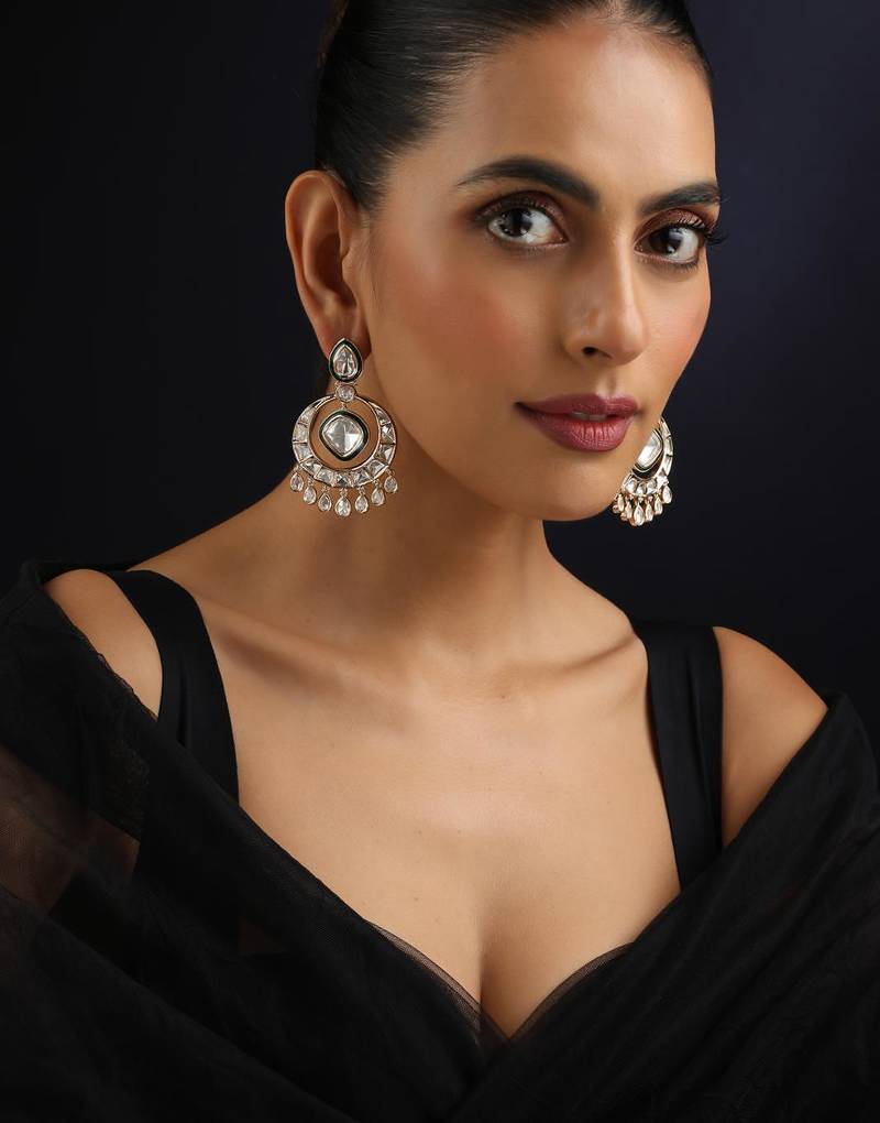 These Gold-Plated Silver Polki Chandbalis Exude Timeless Elegance And Royal Charm. Crafted With Intricate Polki Work On A Silver Base And Finished With Rich Gold Plating, They Offer A Luxurious Appeal. Perfect For Weddings, Festive Occasions, And Cultural Celebrations, They Beautifully Complement Traditional Outfits With Their Graceful And Classic Design.