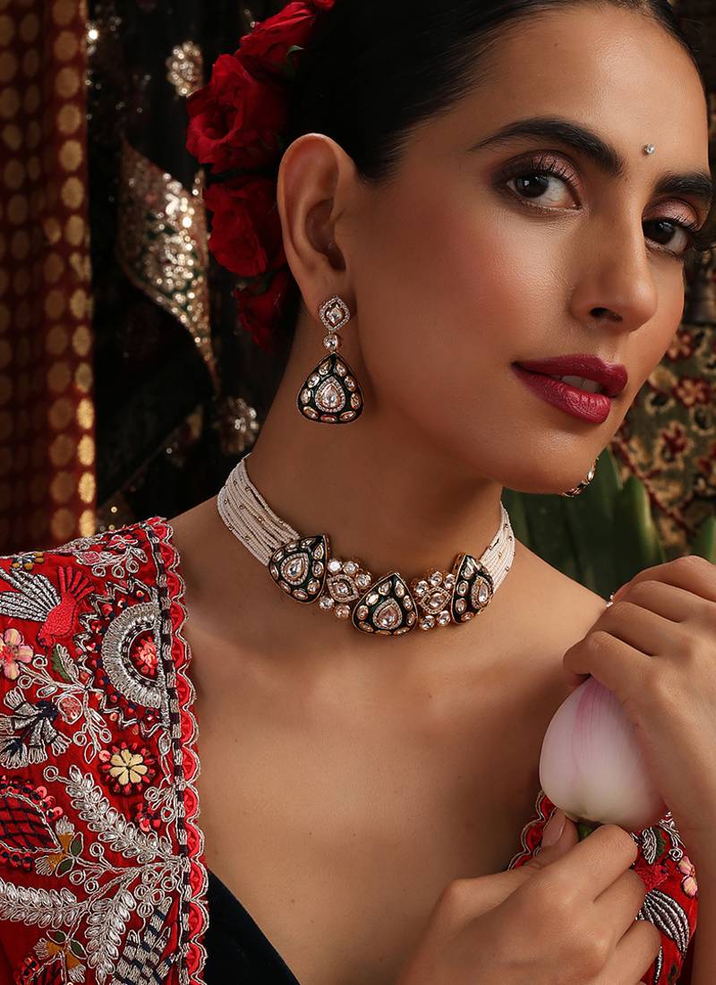 This Rose Gold Plated Kundan Choker Necklace Set Is Adorned With Vibrant Green Stones, Radiating Timeless Elegance And Refined Charm. Featuring Intricate Kundan Craftsmanship, It Beautifully Enhances Traditional And Festive Attire. Perfect For Weddings And Special Occasions, It Adds A Graceful, Statement Touch To Ethnic Ensembles.