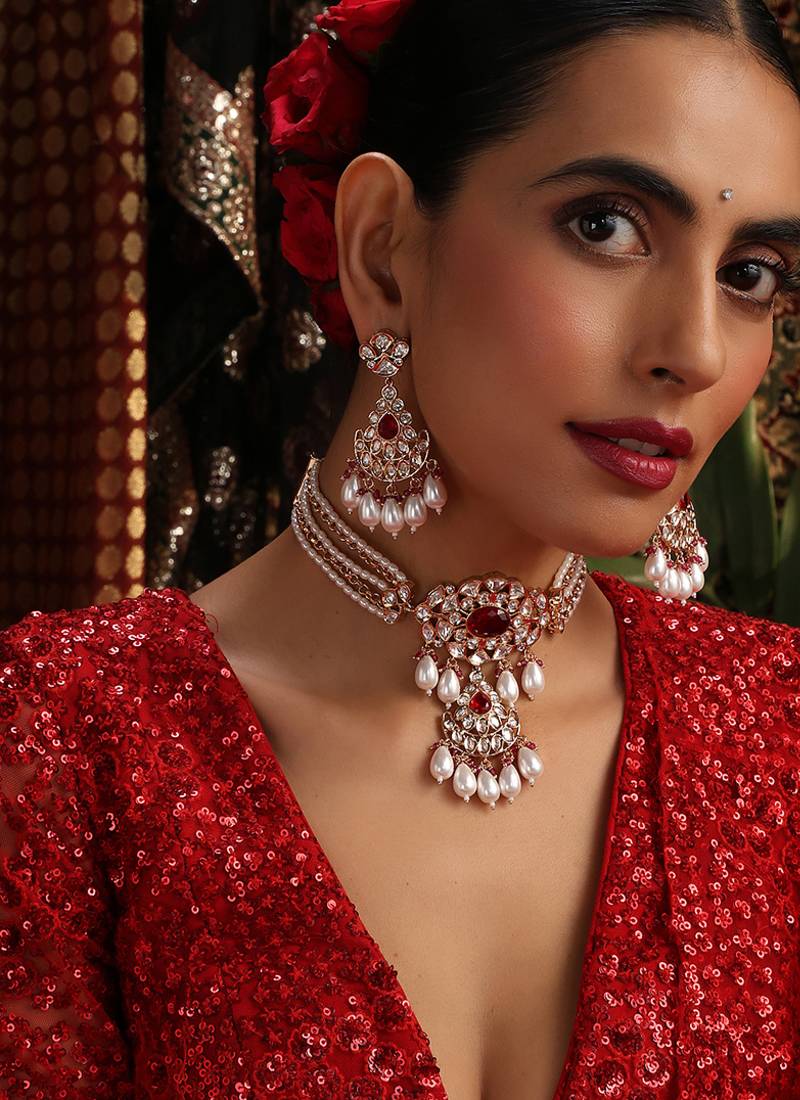 This Rose Gold Plated Kundan Choker Necklace Set Is Adorned With Striking Red Stones, Exuding Timeless Elegance And Regal Charm. Featuring Intricate Kundan Craftsmanship, It Beautifully Enhances Traditional And Festive Attire. Perfect For Weddings And Special Occasions, It Adds A Graceful, Statement Touch To Ethnic Ensembles.