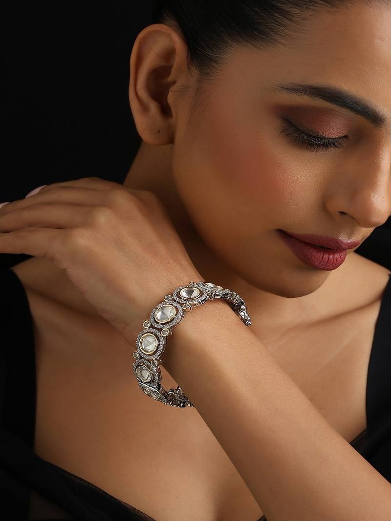 Embrace A Touch Of Modern Elegance With This Silver-Plated Polki Bangle. The Cool, Lustrous Finish Of The Silver Beautifully Contrasts With The Warm, Rustic Sparkle Of Uncut Polki Stones. This Piece Seamlessly Blends Traditional Indian Craftsmanship With A Contemporary Aesthetic, Making It A Versatile And Sophisticated Accessory For Any Occasion