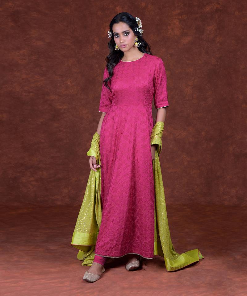 Hot Pink & Lime Green Phulkari Embroidered Anarkali Set