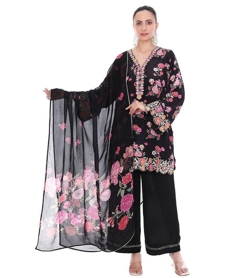 If you find the product for less we'll match it! Know MoreThis Black Printed Crepe Kurta Set Combines Modern Style With Everyday Comfort. The Soft Crepe Fabric Provides A Fluid Drape, While The Subtle Prints Add Visual Interest. Ideal For Casual Outings And Daywear, It Offers A Chic And Versatile Look That Blends Simplicity With Contemporary Elegance Beautifully.