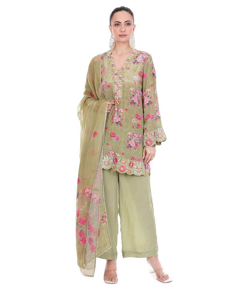 If you find the product for less we'll match it! Know MoreThis Green Embroidered Crepe Kurta Set Offers A Soothing Color With Elegant Detailing. The Lightweight Crepe Fabric Ensures A Smooth Drape And Comfortable Wear, While The Intricate Embroidery Enhances Its Refined Appeal. Perfect For Festive And Semi-Formal Occasions, It Delivers A Graceful And Sophisticated Ethnic Look Effortlessly.