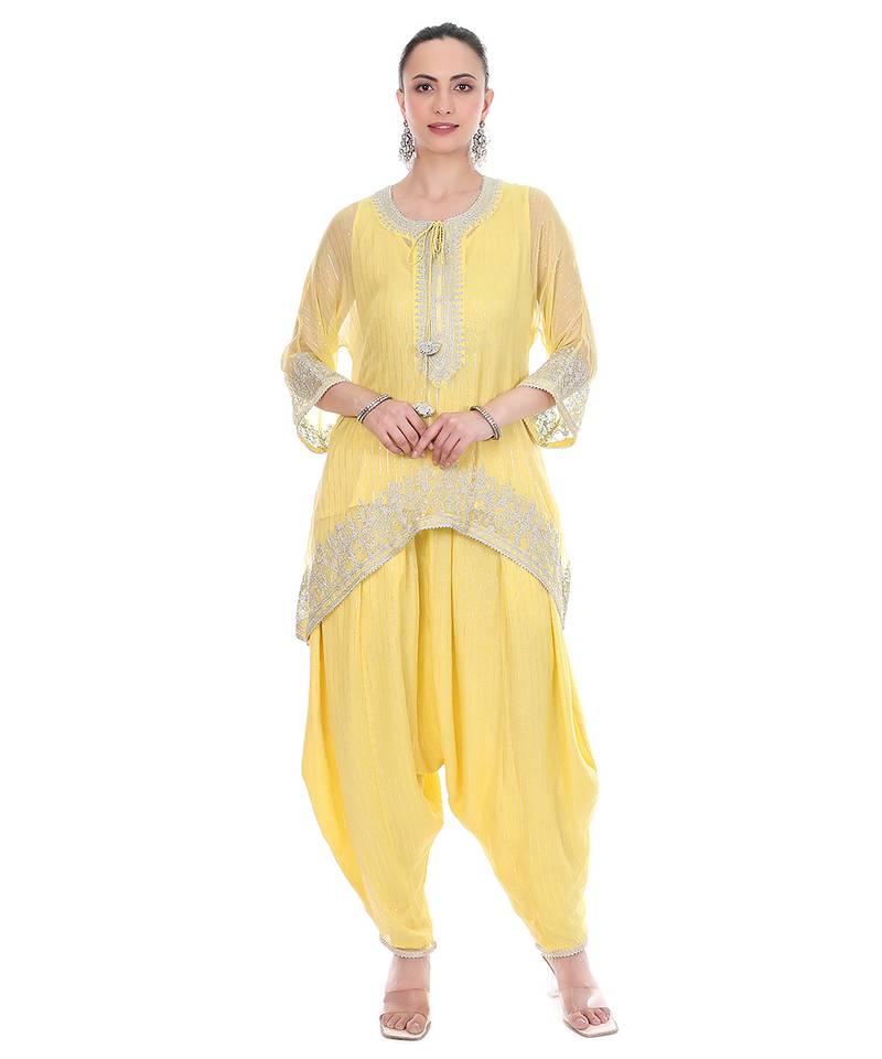 Components: 1 Kaftan :: 1 Pant :: Inner• Product Id : 4749774 • Package Details : 1 Kaftan / 1 Pant / Inner • Type : Kaftans • Fabric : Tissue • Work : Embroidered • Type : Zari Work • Look : Fashion • Sleeve : Quarter Sleeve • Color : Yellow • Stitching : Stitched • Length : 30.0 General - Color and Texture may have slight variation. This happens because of photography.