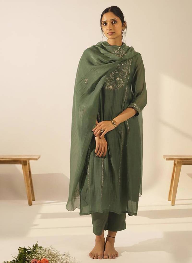 • Product Id : 4686460 • Package Details : 1 Kurta/1 Slip/1 Pants/Dupatta • Type : Readymade Suits For Women • Region : N/A • Fabric : Chanderi • Work : Embroidered • Type : Resham Embroidery • Look : Contemporary • Sleeve : Quarter Sleeve • Neck Style : V Neck • Color : Green • Stitching : Stitched Payments [+]