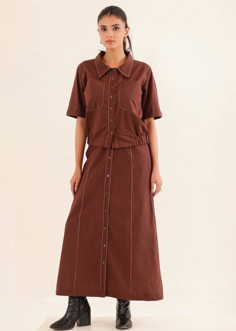 • Product Id : 4677884 • Package Details : 1 Top/1 Skirt • Type : Co Ord Sets • Fabric : Cotton • Work : Plain • Sleeve : Quarter Sleeve • Occasion : Formal • Color : Brown • Stitching : Stitched • Neck Style : Shirt Collar • Style : Shirt Style • Length : Calf Length • Length : Calf Length Payments [+]