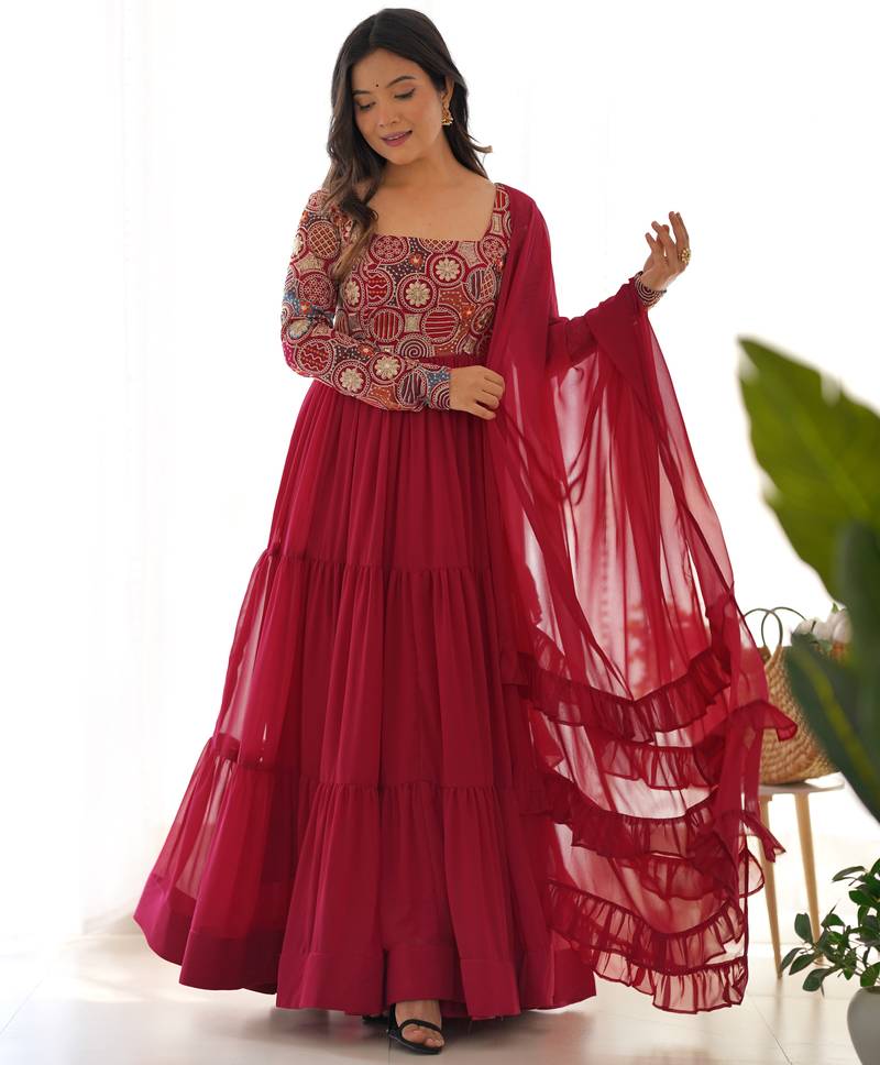 Maroon Color Faux Georgette Embroidery Work Gown