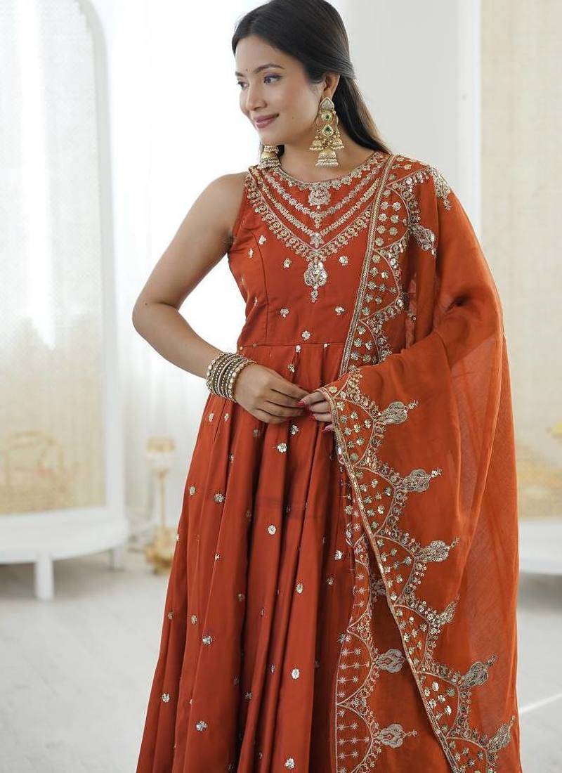 Orange Color Roman Silk Embroidery Work Party Wear Gown Stitched