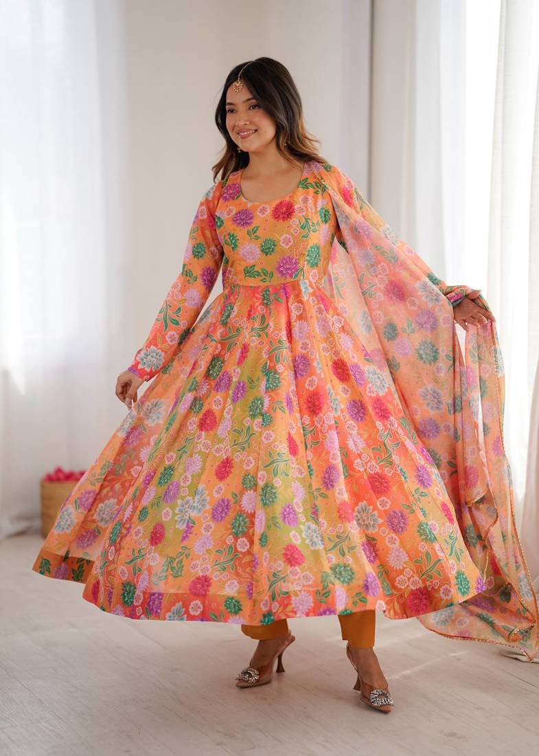 Orange Color Soft Organza Silk Digital Printed Party Wear Gown Stitched