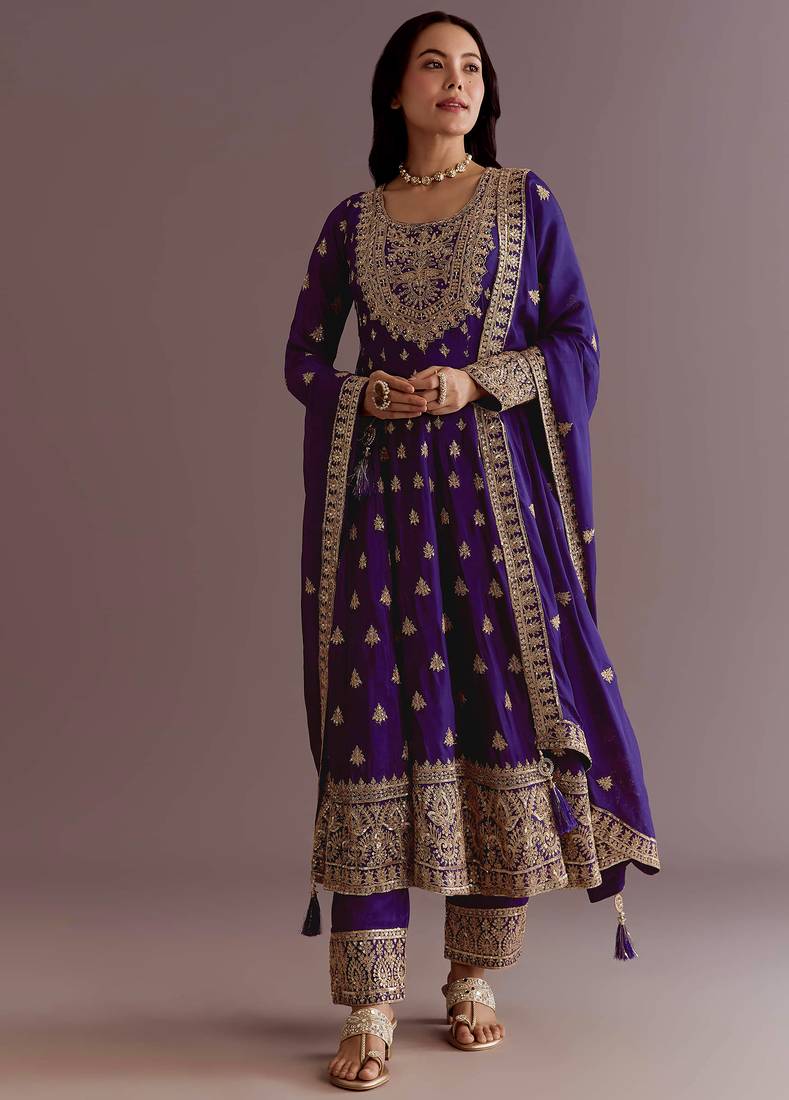 Purple Chinnon Silk Heavy Embroidery Work Designer Party Wear Gown Stitched