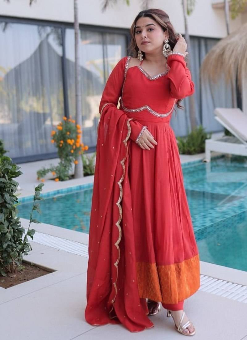 Womens New Stylish Mul Chanderi With Rich Mirror Lace Work Kurta Set Stitched