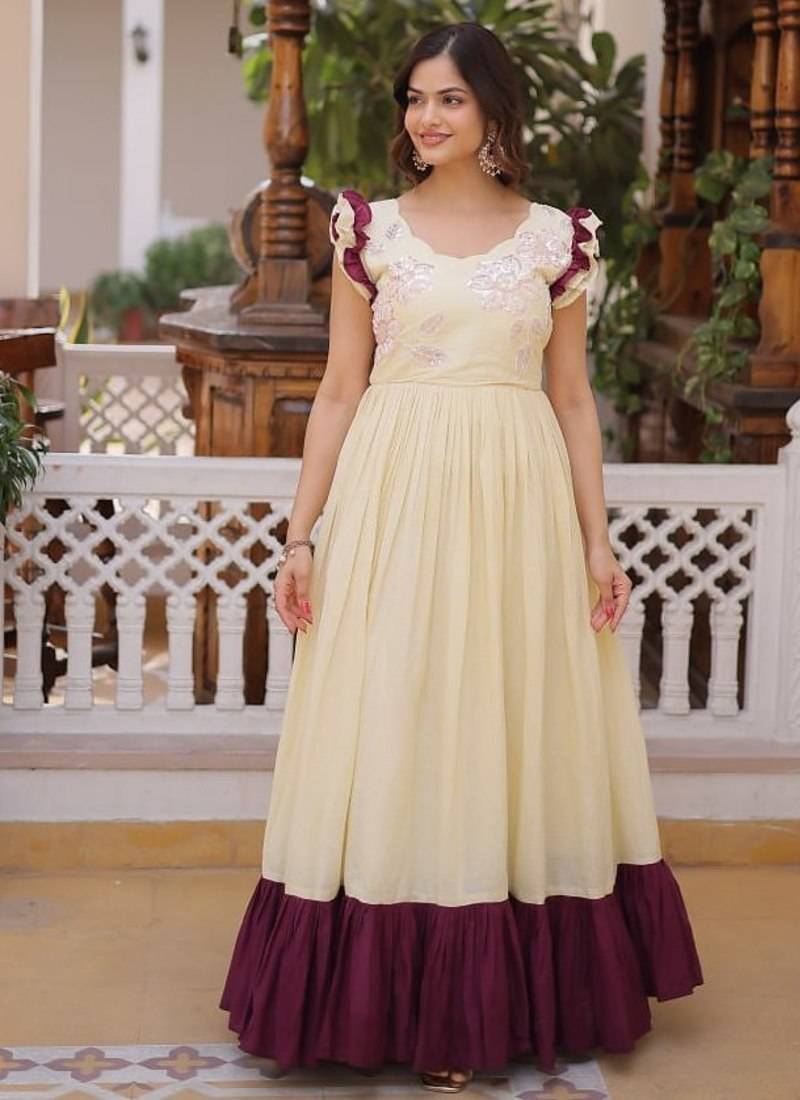 • Product Id : 4758696 • Package Details : 1 Gown/ • Type : Anarkali Suit • Work : Embroidered • Type : Sequins Work • Look : Designer • Sleeve : Short Sleeve • Neck Style : Round Neck • Fabric : Silk • Color : Cream • Stitching : Stitched General - Color and Texture may have slight variation. This happens because of photography.