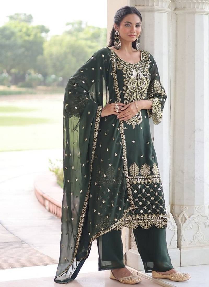 • Fabric : Silk • Color : Green • Style : Palazzo • Color : Green Dupatta Details
