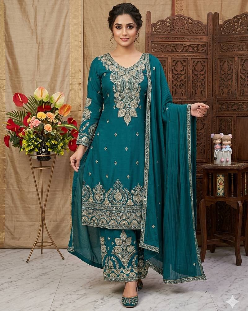 • Product Id : 4760558 • Package Details : 1 Top/1 Bottom/1 Dupatta • Type : Bollywood Salwar Kameez • Work : Embroidered • Type : Sequins Work • Look : Designer • Sleeve : Quarter Sleeve • Neck Style : V Neck • Fabric : Silk • Color : Teal • Stitching : Stitched General - Color and Texture may have slight variation. This happens because of photography.