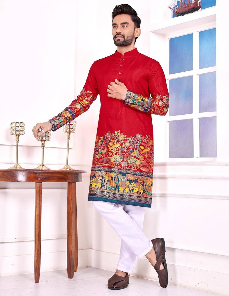 • Product Id : 4679234 • Package Details : 1 Kurta • Type : Kurta • Occasion : Ceremonial • Fabric : Silk • Work : Printed • Type : Patola Silk • Look : Fashion • Sleeve : Full Sleeve • Neck Style : Chinese Collar Kameez • Color : Red • Top Color : Red • Top Fabric : Silk • Stitching : Stitched Payments [+]