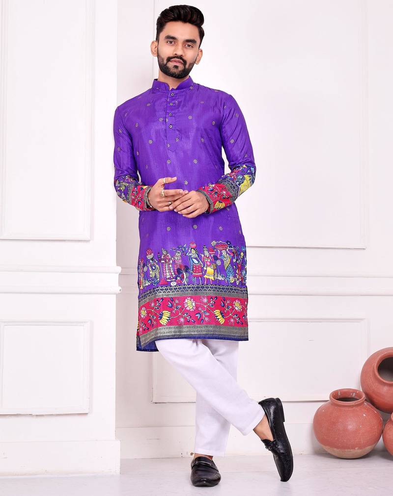 • Product Id : 4679252 • Package Details : 1 Kurta • Type : Kurta • Occasion : Wedding • Fabric : Silk • Work : Printed • Type : Patola Silk • Look : Designer • Sleeve : Full Sleeve • Neck Style : Chinese Collar Kameez • Color : Violet • Top Color : Purple • Top Fabric : Silk • Stitching : Stitched Payments [+]