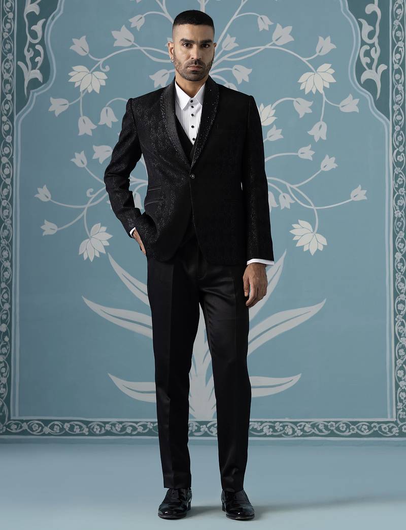 Black Self Textured Tuxedo Set