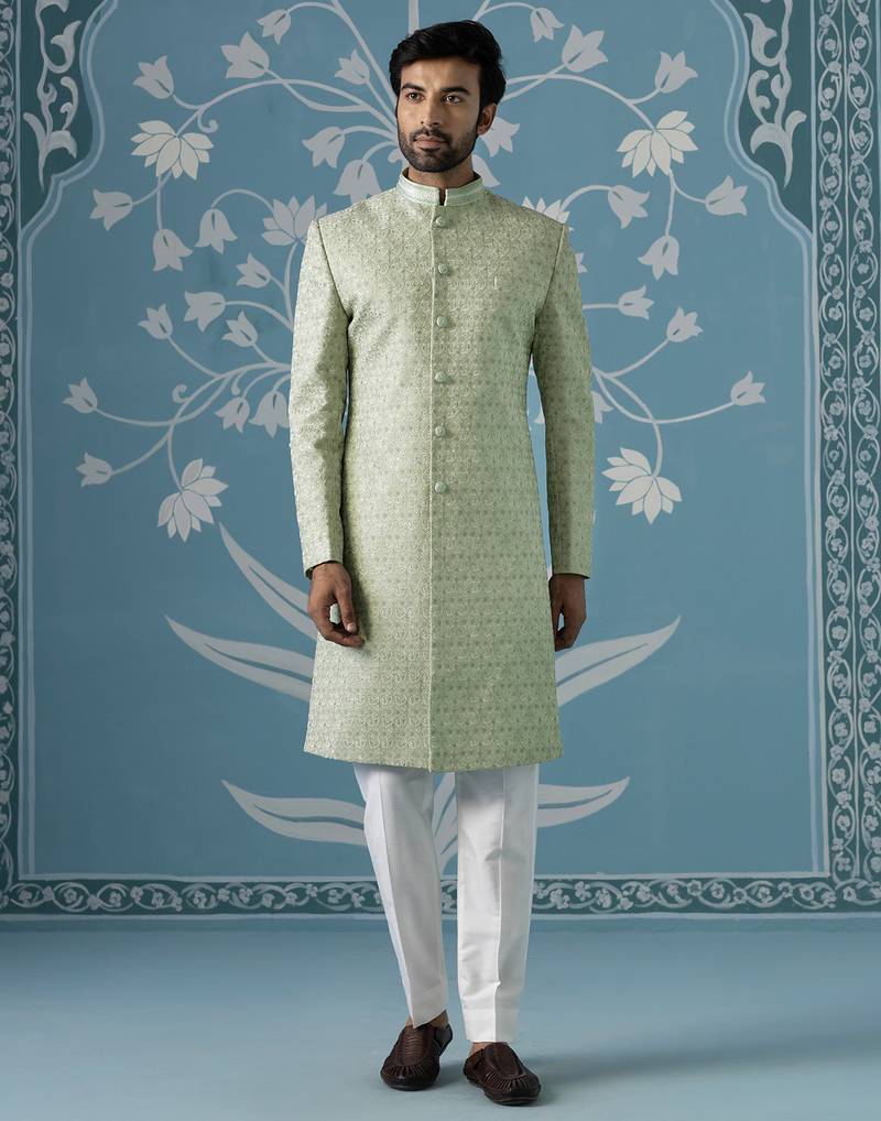 • Product Id : 4697394 • Package Details : 1 Sherwani / 1 Bottom • Type : Sherwani • Work : Embroidered • Look : Fashion • Sleeve : Full Sleeve • Color : Green • Top Color : Green • Top Fabric : Jacquard • Stitching : Stitched Payments [+]