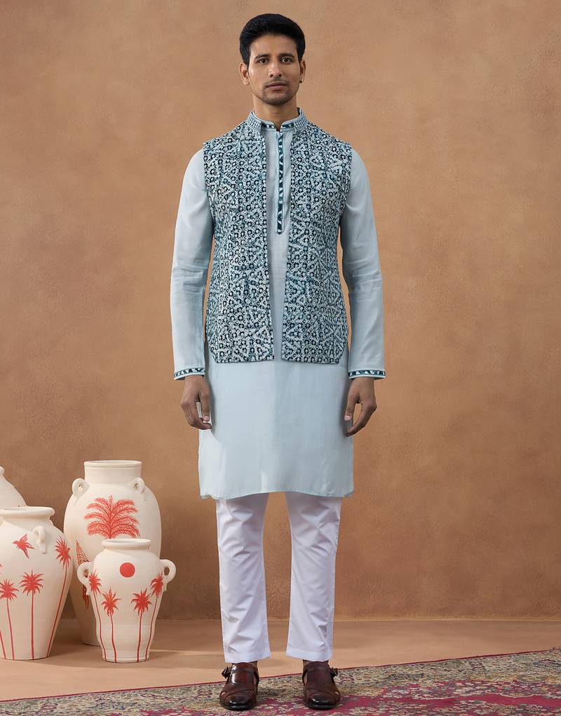 Light Blue Ikat Print Bundi With Kurta Set