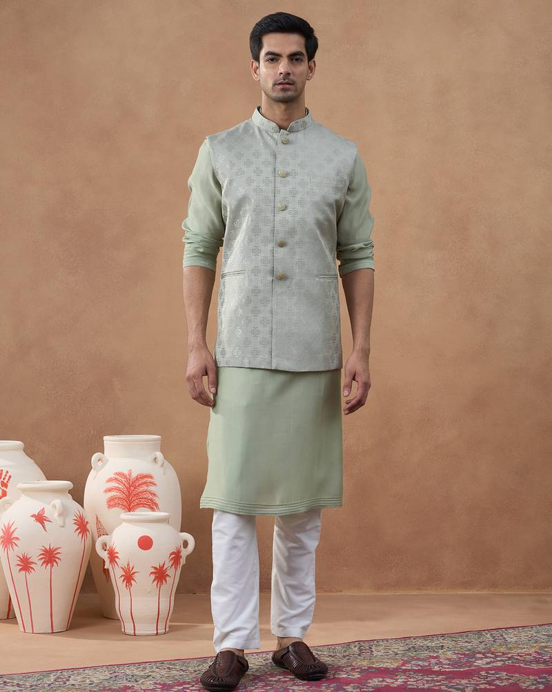 • Product Id : 4697458 • Package Details : 1 Jacket / 1 Kurta / 1 Bottom • Type : Nehru Jacket • Work : Embroidered • Look : Fashion • Sleeve : Full Sleeve • Color : Green • Top Color : Green • Top Fabric : Georgette • Stitching : Stitched Payments [+]