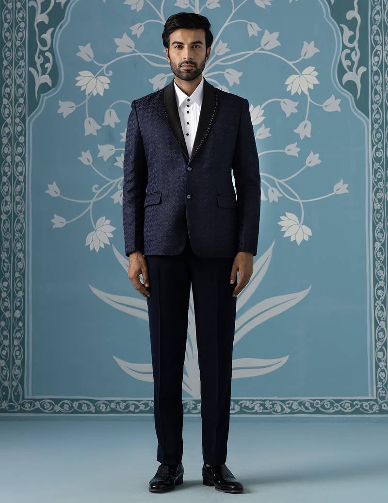 Navy Textured Blazer With Tuxedo Shirt