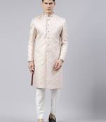 Introducing the Peach Jacquard Achkan from TheEthnic.co. This nawab style achkan perfectly balances sophistication with culture. Crafted in imported jacquard fabric featuring a light peach color is sure to make you look best dressed wherever you go. The tonal leaf motif adds a subtle flair and ensures that you'll stand out in any situation. Perfect for special events such as a wedding, this Achkan is sure to elevate your wardrobe. With hand embroidery on the collar and button, you'll look effortlessly elegantno matter the occasion! Paired with tailored pants, this is a great statement piece for any man's wardrobe.