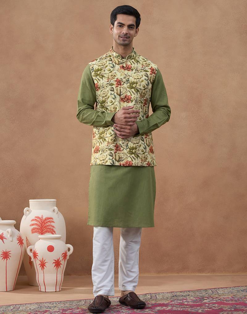 Sage Green Floral Print Bundi With Kurta Set