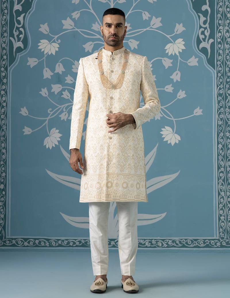 • Product Id : 4697397 • Package Details : 1 Sherwani / 1 Bottom • Type : Sherwani • Work : Embroidered • Look : Fashion • Sleeve : Full Sleeve • Color : White • Top Color : White • Top Fabric : Cotton • Stitching : Stitched Payments [+]
