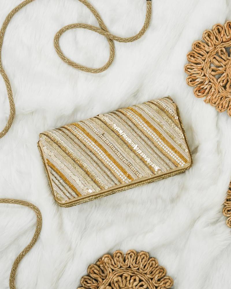 If you find the product for less we'll match it! Know MoreThis Gold Silk Sequin Embroidered Clutch Is A Glamorous Accessory That Adds Sparkle And Sophistication To Any Outfit. Crafted From Premium Silk, It Features Intricate Sequin Embroidery That Catches The Light Beautifully. Compact Yet Functional, With A Secure Closure, It Is Perfect For Weddings, Parties, And Festive Celebrations.