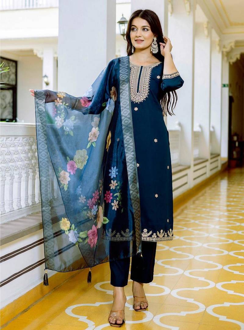 Teal Viscose Chanderi Embroidery Work Straight Kurta Pant And Dupatta Set