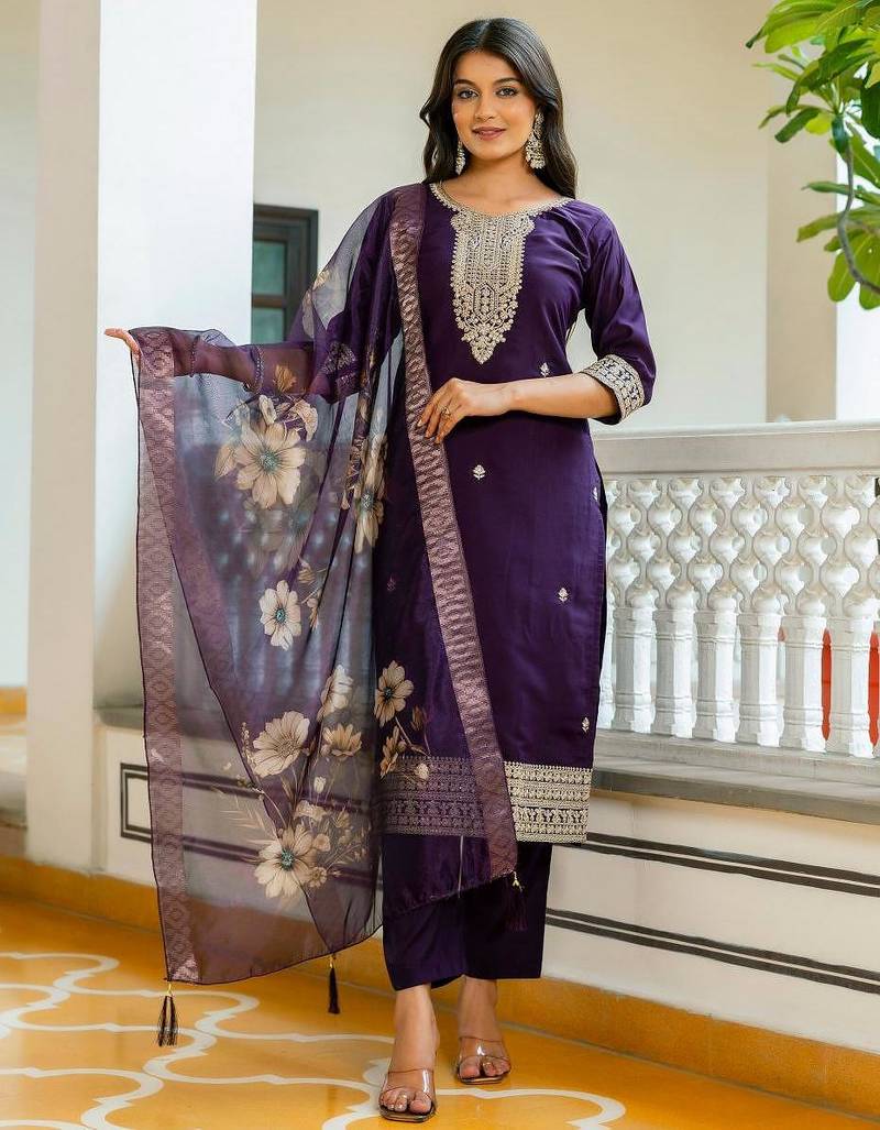 Purple Viscose Chanderi Embroidery Work Straight Kurta Pant And Dupatta Set
