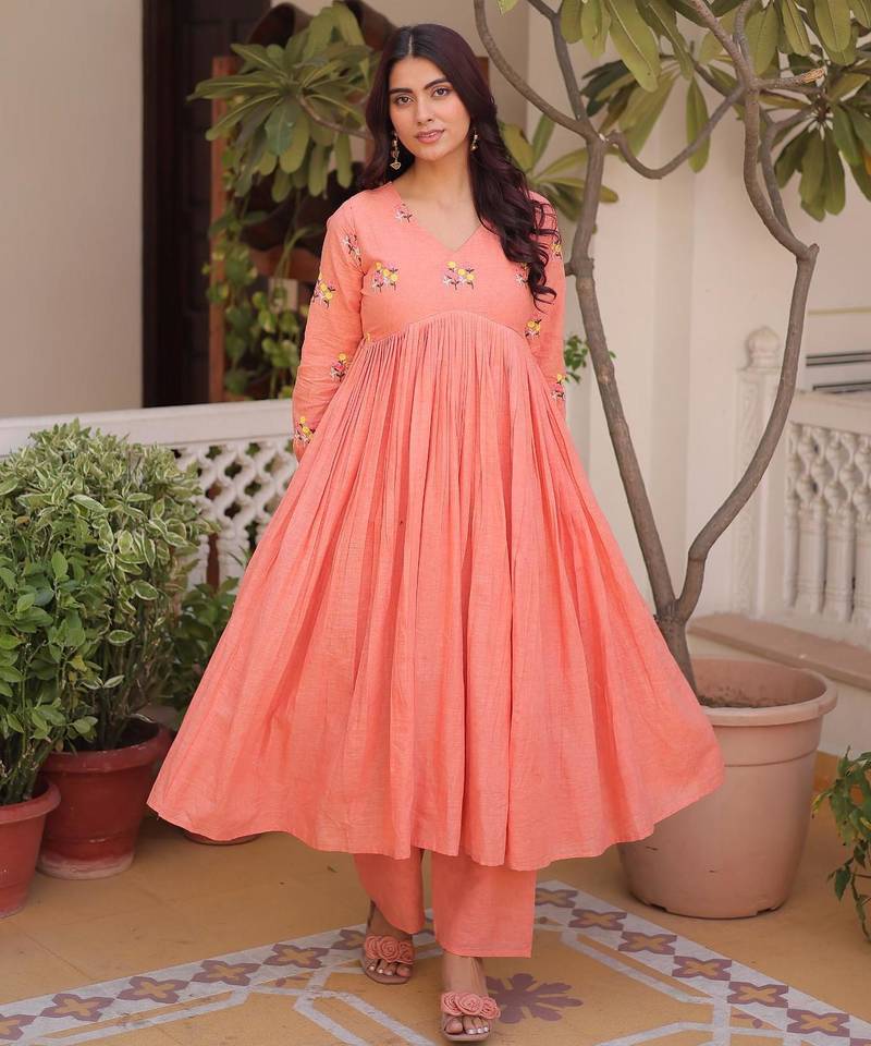 • Product Id : 4714914 • Package Details : 1 Kurta / 1 Pant • Type : Kurta Sets • Occasion : Casual • Fabric : Cotton • Work : Embroidered • Type : Resham Embroidery • Look : Fashion • Sleeve : Full Sleeve • Neck Style : V Neck • Color : Peach • Stitching : Stitched • Length : 46.0 Payments [+]