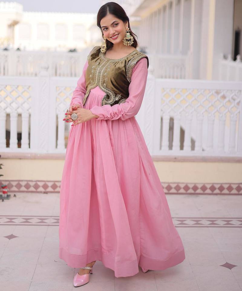 • Product Id : 4693093 • Package Details : 1 Gown / 1 Koti • Type : Anarkali Suit • Occasion : Wedding • Type : Sequins Work • Look : Fashion • Sleeve : Full Sleeve • Neck Style : Round Neck • Fabric : Chanderi • Color : Pink • Work : Self Design • Stitching : Stitched Payments [+]